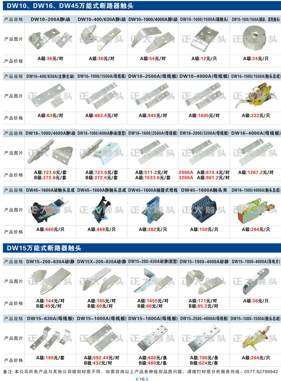 DW10、DW16、DW45、DW15万能式断路器触头